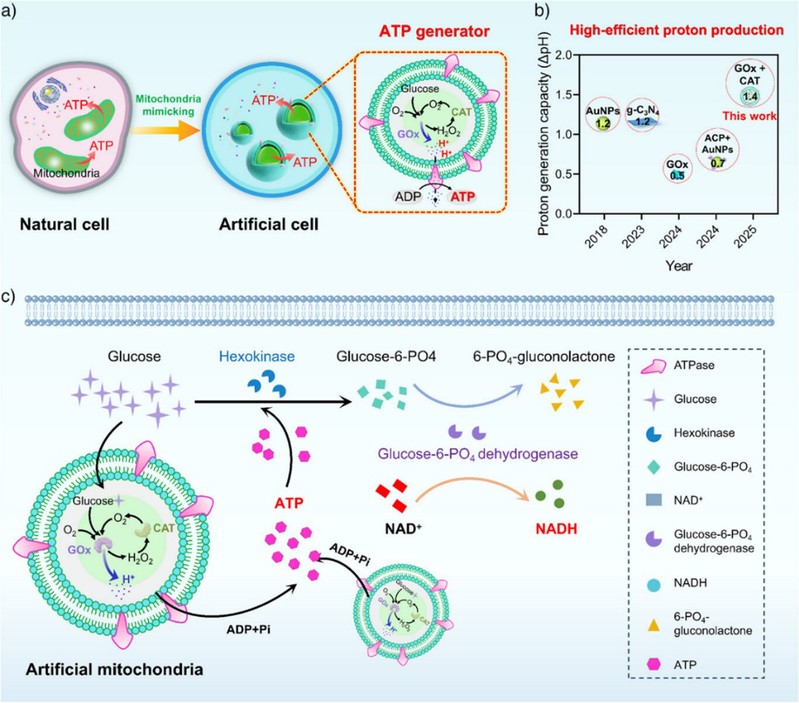 生物大分子的安全、可控递送对于合成生物学和药物递送领域具有重要意义。天然细胞通过多种功能模块的精确组装,实现内部过程的自主协调以执行复杂生理活动。其中,能量供应模块(如产生三磷酸腺苷(ATP)的线粒体)对维持细胞代谢至关重要。研究团队设计了一种具备自增强质子生成能力的人造线粒体(图1a),其中CAT可快速分解有毒中间体H₂O₂生成O₂,促进GOx的催化循环,显著提升质子产率并建立稳健的跨膜质子梯度以驱动ATP合成。与既有GOx驱动系统(ΔpH≈0.5)、g-C₃N₄光催化系统(ΔpH≈1.2)及金纳米颗粒-酸性磷酸酶系统(ΔpH≈0.7)相比,该体系可实现更强的质子驱动力(ΔpH≈1.4)(图1b)。将该人工线粒体嵌入巨型囊泡后,可在人工细胞内实现以葡萄糖为底物的ATP自供驱动NADH合成(图1c),展现出高效的能量转换与代谢耦联能力。该人造能量模块为实现自主能量供给的人工生命系统奠定了基础,并为自下而上的合成生物学发展提供了新的策略平台。