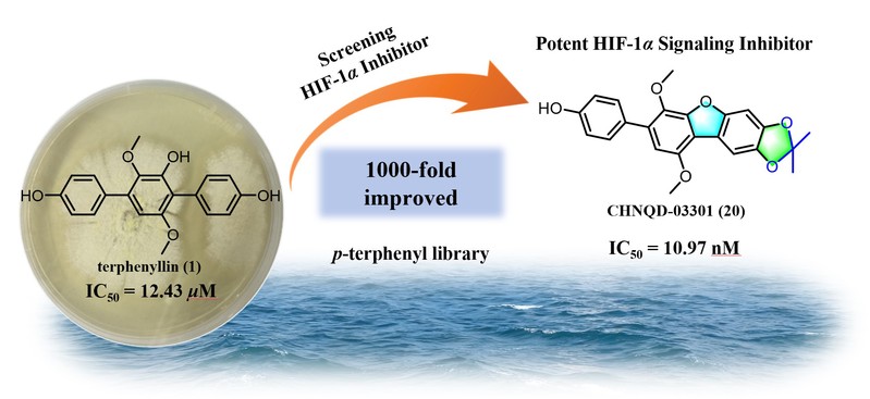 研究团队从海洋真菌Aspergillus candidus来源的天然产物terphenyllin出发,通过活性筛选发现其对HIF-1α信号通路具有抑制作用。设计合成并构建了三联苯库,对该类化合物的活性和构效关系(SAR)进行了评价。发现了一种口服天然苯并呋喃对三联苯衍生物 CHNQD-03301(IC₅₀ = 10.97 nM),它带有罕见的丙酮叉基团,是一种具有强效活性的 HIF-1α信号抑制剂。