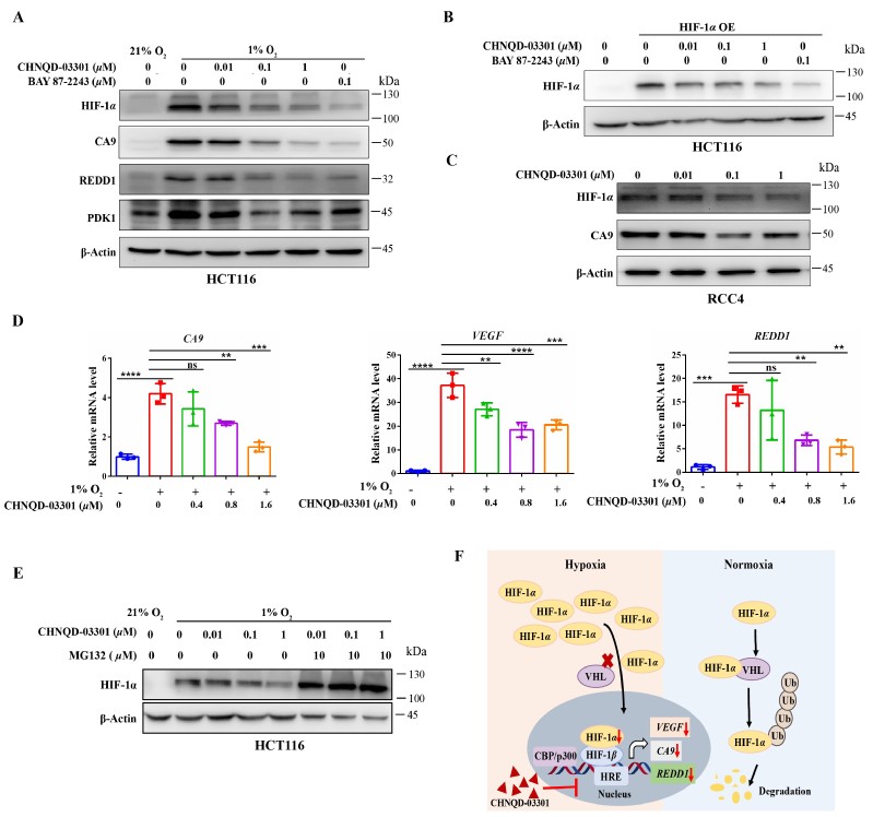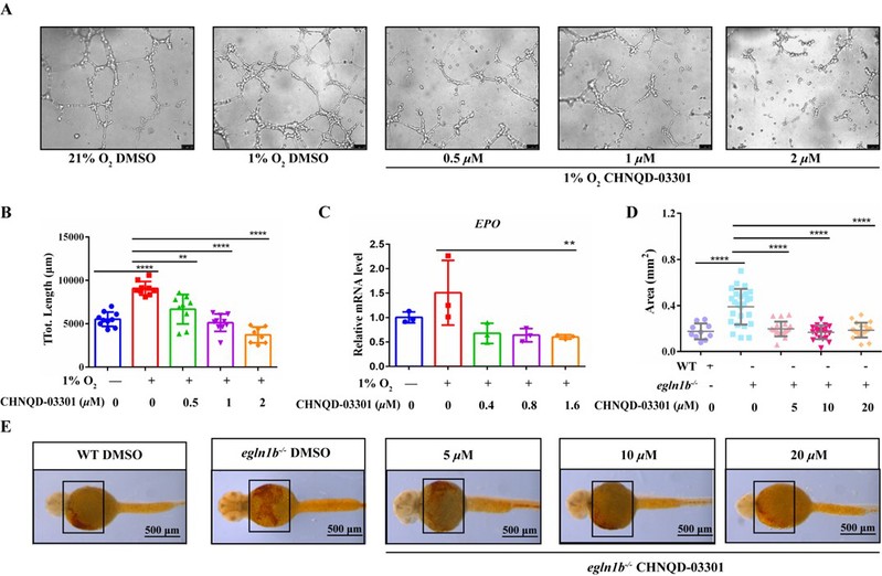 从机制上讲,该化合物促进了HIF-1α蛋白的蛋白酶体降解,显著抑制其蛋白水平及下游靶基因(如CA9、VEGF、REDD1等)的表达,且该作用不依赖于VHL蛋白。进一步研究表明,在斑马鱼模型中,它能够逆转 HIF 积累诱导的血管生成,并减轻 HIF 诱导的红细胞增多表型。