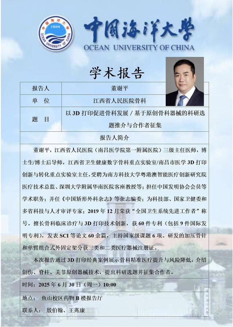 报告题目:以3D打印促进顾客发展\基于原创骨科器械的科研选题推介与合作者征集