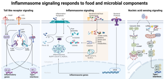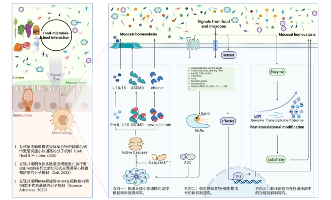 目前固有免疫研究主要聚焦在Toll 样受体信号(Toll like receptor signaling)、Nod样受体介导的炎症小体信号(Inflammasome signaling)和MAVS/cGAS介导的感知信号(MAVS/cGAS signaling)三大信号通路。其中Nod样受体能特异识别食物或微生物组分,激活NLRs-ASC-Caspase1/11-IL1 family/GSDMD经典炎症小体通路,在抗感染和炎症调控中至关重要。肠道上皮细胞高表达NLRP6和NLRP9,肠道固有免疫细胞高表达NLRP1、NLRP3、NLRC4和NLRP12等受体。两者均组成或诱导型高表达ASC、Caspase1、Caspase11、IL1、IL18和GSDMD等下游关键元件。2022年以来,全球针对炎症小体通路治疗炎症性疾病的抑制剂临床试验爆发式增长。然而,肠道特异炎症小体通路的激活和调控机制仍不明确。因此深入揭示食物-微生物信号调控肠道炎症小体的分子机制机及其新功能,将为阐明肠道感染与炎症疾病机理、研发组织特异性靶向药提供重要理论基础。 三、我的研究进展和未来研究方向: 近年来,我们围绕肠道炎症小体通路和翻译后修饰系统,在肠道食物耐受和抗感染免疫领域取得了突破性进展:1.我们发现在小肠前端半胱天冬氨酸蛋白酶Caspase3/7能够直接识别蛋白质降解形成的多肽分子被激活,活化的Caspase3/7切割细胞焦亡执行者GSDMD产生新型的13 kDa非死亡剪切形式。该剪切转位进入细胞核调控二类分子MHCII的表达并维持小肠前端Tr1细胞类群,最终介导食物耐受的形成。该研究证明了GSDMD的差异性切割是控制小肠免疫与耐受的调控枢纽(Cell, 2023)。2.我们发现细胞核定位的RNA解旋酶DHX9结合转录因子STAT1,调控I型干扰素通路下游STAT1介导ISGs基因的转录过程。该发现首次在体内证实了DHX9的抗病毒作用并解析了核定位DHX9的非胞质感受器的分子机制(Science Advances,2023)。3.我们发现了NLRP6的第一个翻译后写手,首次揭开了单泛素化在NLR家族蛋白激活中的潜在关键作用,并提出了NLRP6炎症小体活化的“双保险模型”:即通过K680-687位点驱动构象转变依赖的寡聚,和通过K115-130引发空间位阻维持胞质定位,两者协同确保炎症小体的高效、精准激活。这一发现深化了对蛋白质翻译后修饰调控免疫信号的理解,也为未来靶向NLRP6通路调控肠道炎症及相关药物优化提供了重要的理论依据(Cell Host & Microbe, 2026)。今后我们将继续以肠道巨噬细胞与上皮细胞中的炎症小体通路及翻译后修饰系统为核心,围绕肠道感染与炎症性疾病的致病机制开展深入研究:1.解析食物-微生物-宿主互作的新通路与调控机制;2.探索肠道炎症小体通路的调控机制及其新功能;3.阐明翻译后修饰系统在肠道疾病中的功能及作用机制。